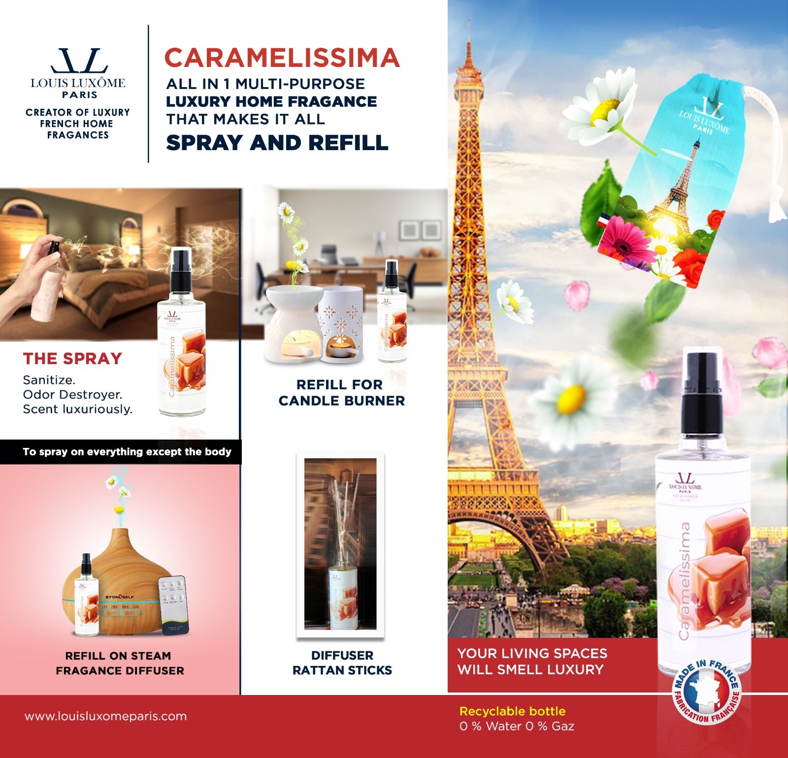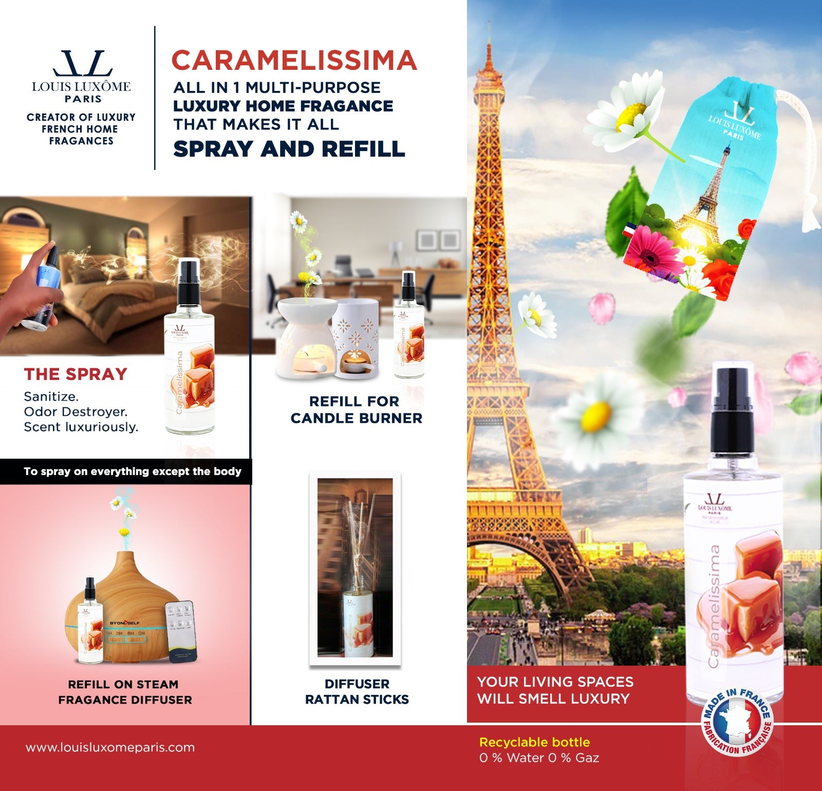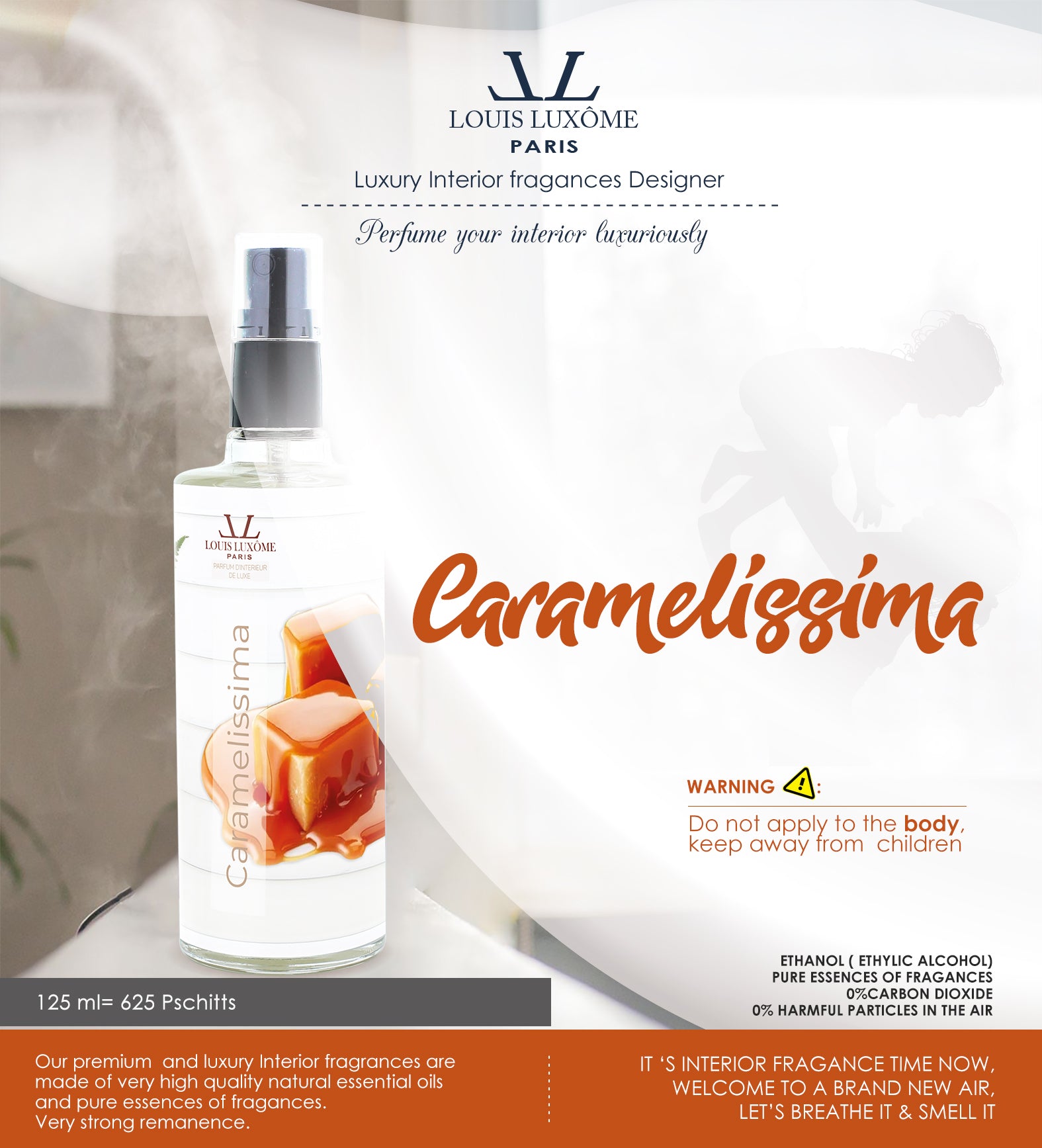- By spraying Our French LOUIS LUXÔME PARIS home fragrance CARAMELISSIMA into your living spaces, they will play the role of: