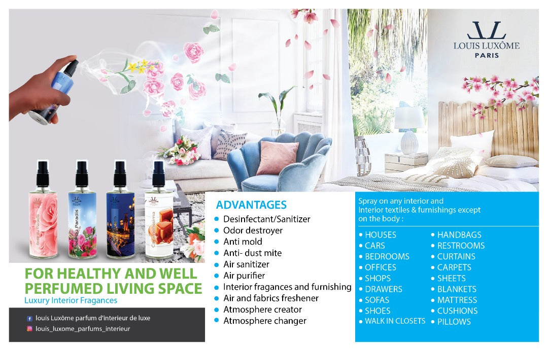 - LOUIS LUXÔME PARIS innovates in Luxury Home Perfumery by offering french luxomizing sprays, also known as Louis Luxôme Paris French Luxury Home Fragrances MADE IN FRANCE, some of them are inspired by major luxury body Fragances brands and others inspired by exotic and heavenly scents, with the particularity of Premium Quality Natural Essential Oils and Refined Perfume Oils as components being the best ingredients in terms of INTERIOR PERFUMERY.