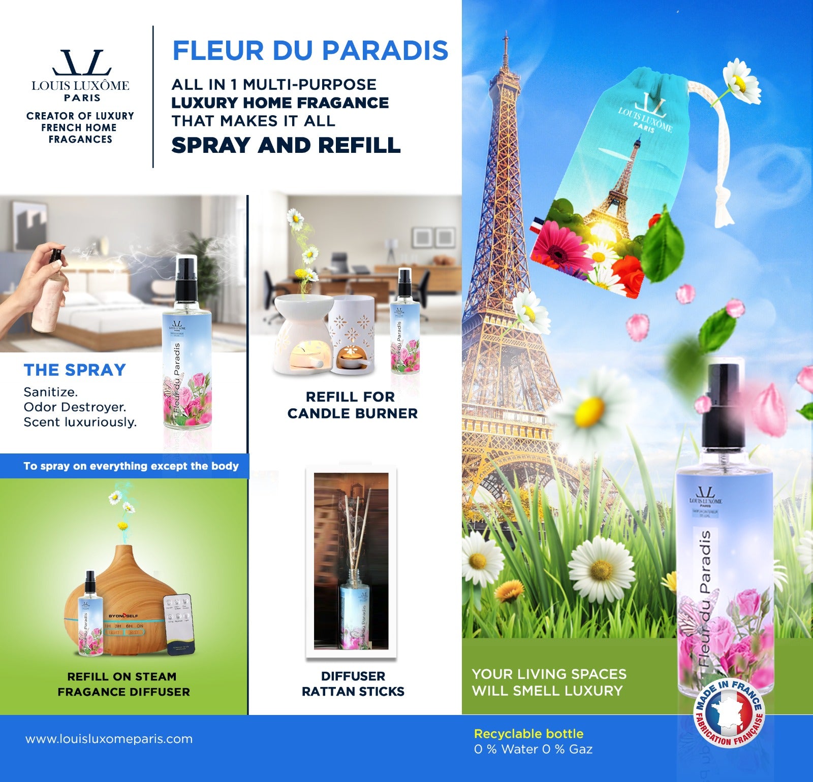 - By spraying Our French LOUIS LUXÔME PARIS home fragrance FLEUR DU PARADIS into your living spaces, they will play the role of: